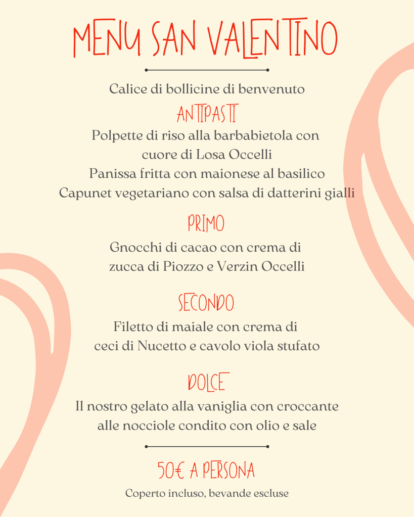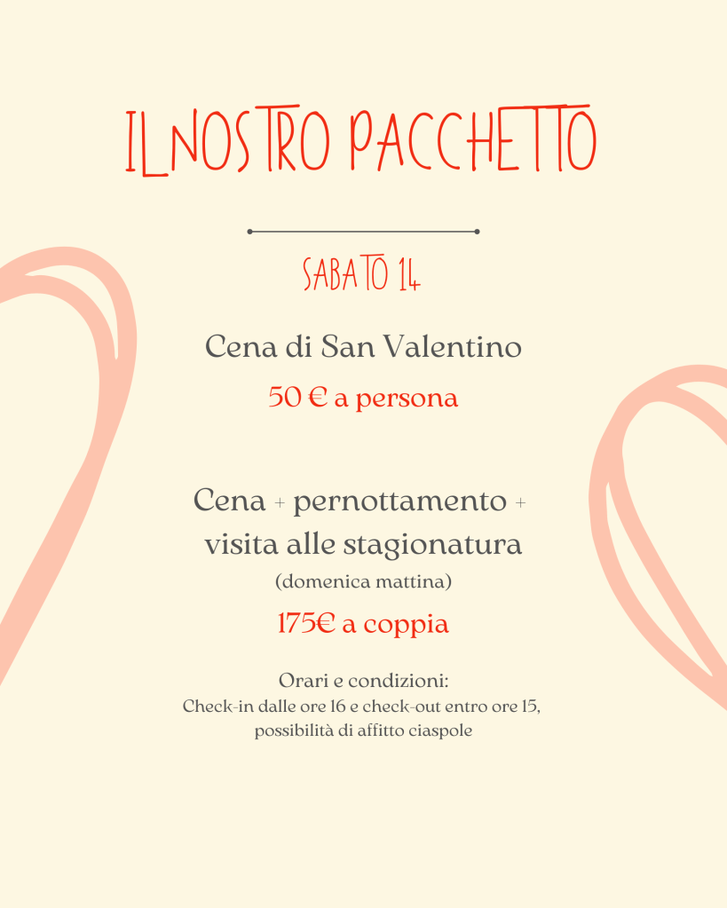 Un menu di San Valentino pensato per esaltare le materie prime e i sapori del territorio, abbinato alla possibilità di vivere un esperienza completa: cena, pernottamento nelle nostre camere, visita alle stagionature e la possibilità di affittare le ciaspole.